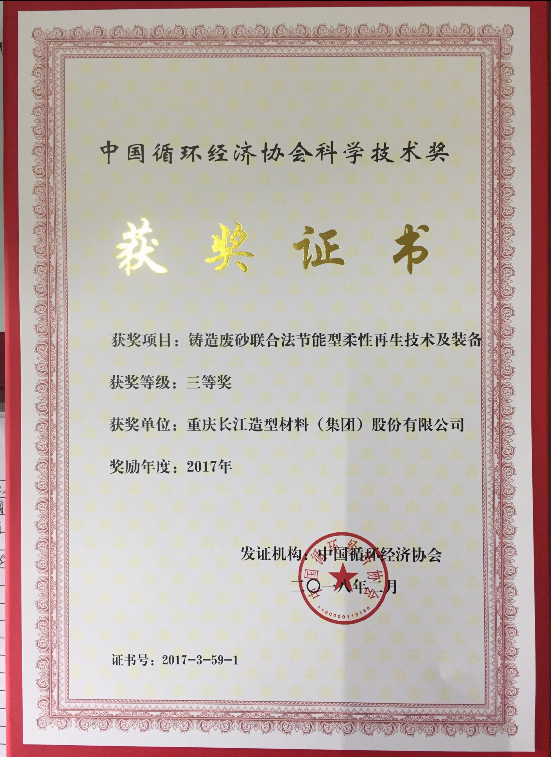 ▲2017年1月 铸造废砂再生设备被授予“重庆市高新技术产品”(有效期三年)
