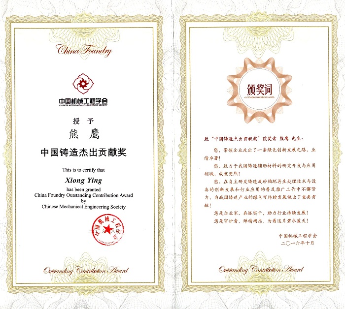 ▲2016年10月 中国机械工程学会授予熊鹰“中国铸造杰出贡献奖”
